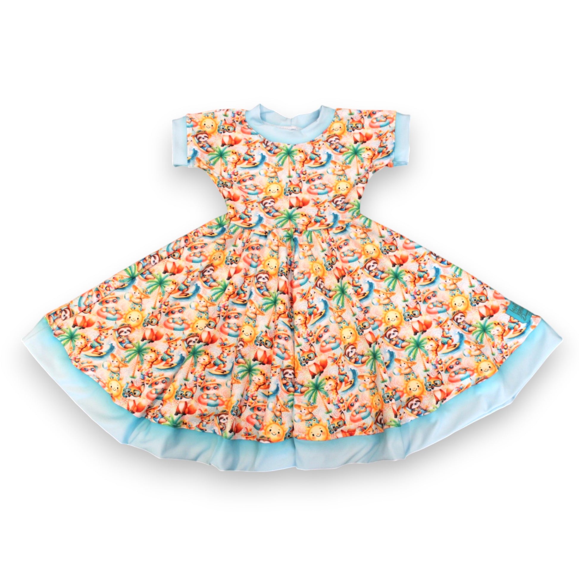 Robe 100% polyester avec motif au choix, et étiquette de couleur assortie.