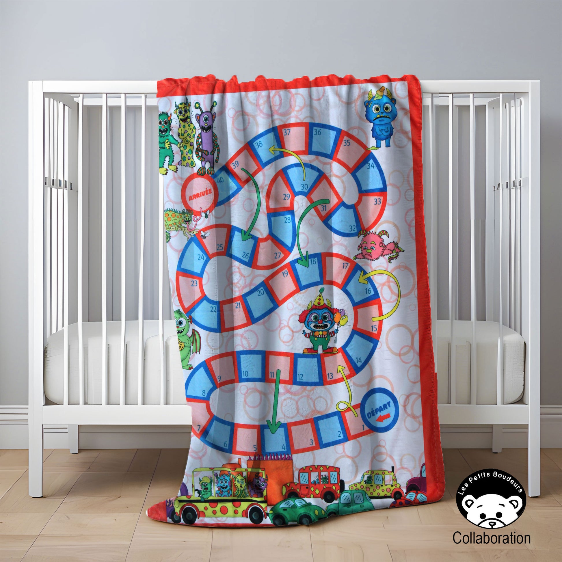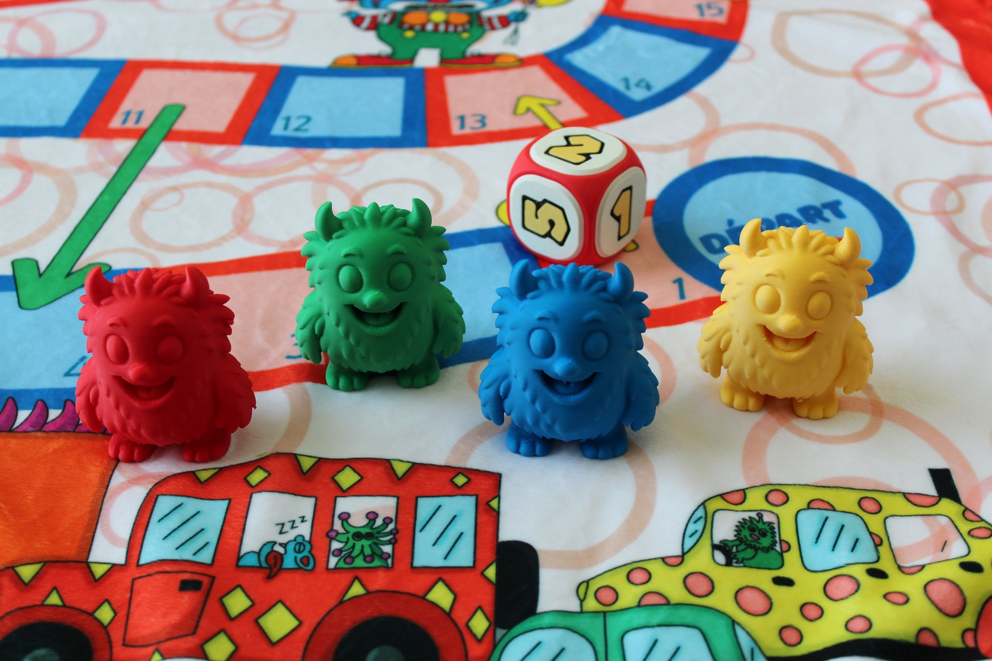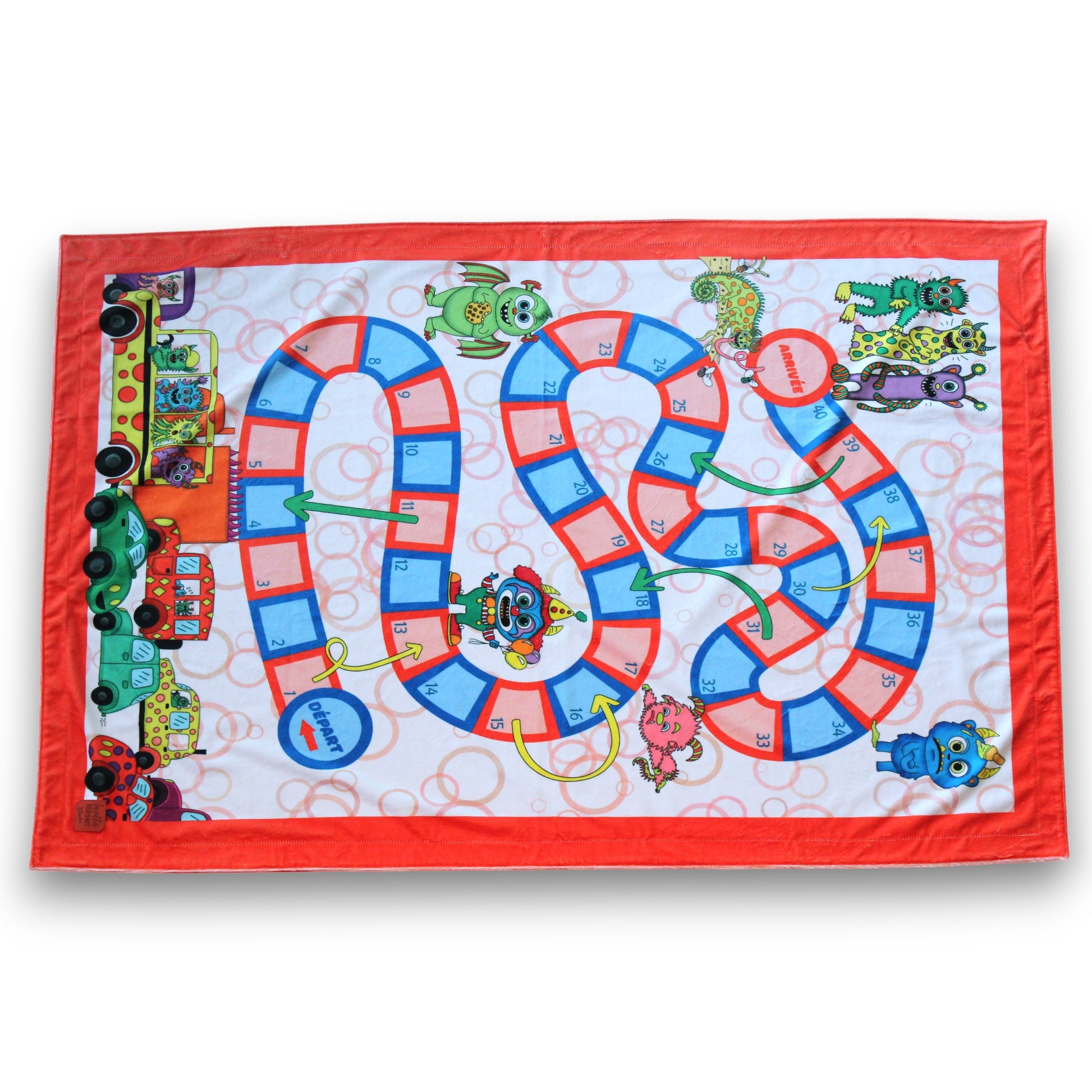 Doudou double 100% polyester avec motif jeux de table. Inclus 4 pions de jeux assortir et un dé fabriqué en 3D avec plastique recyclé.